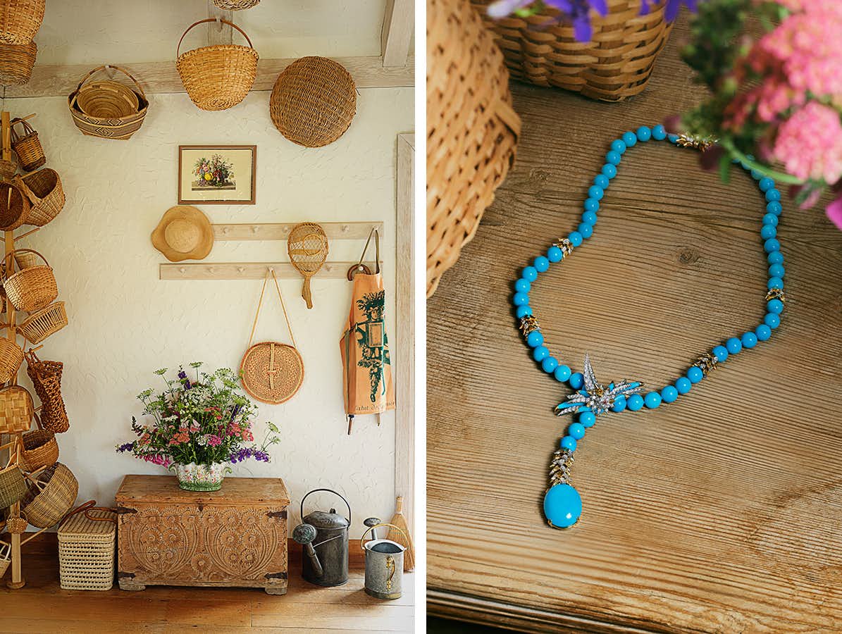The other suite is devoted to turquoise, a stone beloved by Schlumberger for its vibrant, often unpredictable character. A standout necklace features a diamond bird clasping strands of cabochon turquoise with gold and diamond feathers cascading downward. The colour recalls Tiffany’s robin’s-egg blue boxes and, perhaps more poignantly, the skies above Oak Spring Garden.